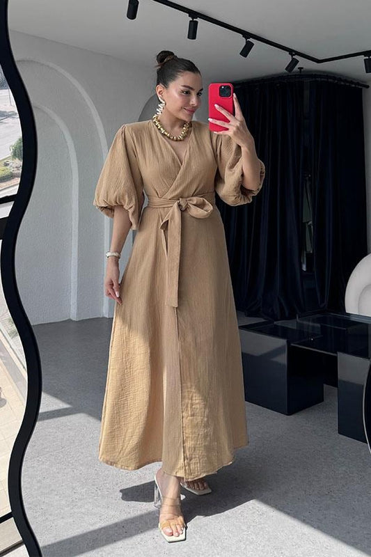 Antelo Müslin Kumaş Balon Kol Elbise - Karamel