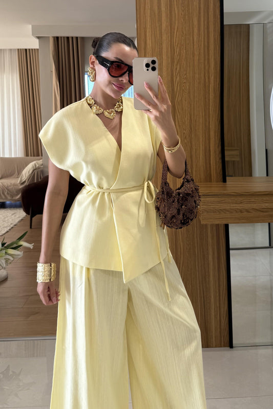 3 AL 2 ÖDEAnselie Sarı Keten Yelek Pantolon Takım