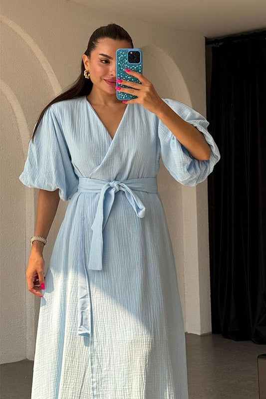 Antelo Müslin Kumaş Balon Kol Elbise - Bebe Mavi