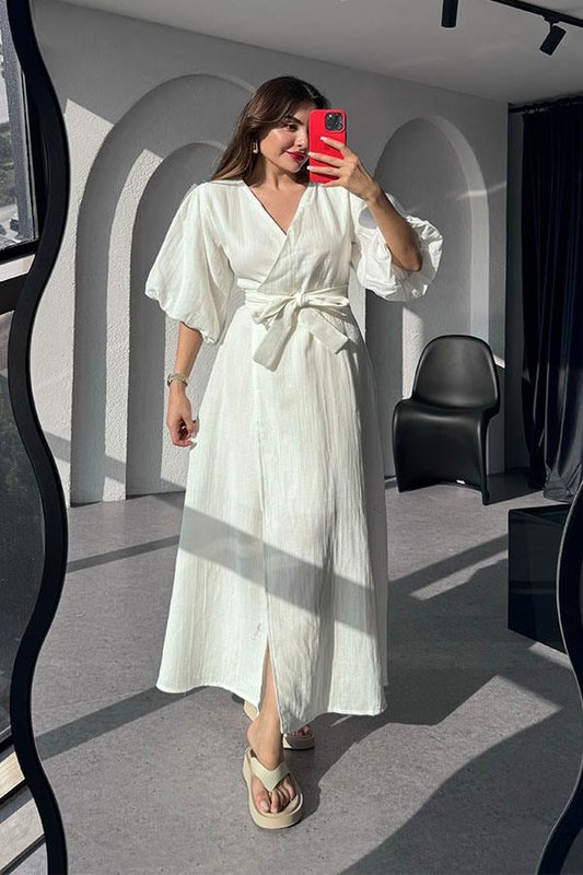 3 AL 2 ÖDEAntelo Müslin Kumaş Balon Kol Elbise - Beyaz