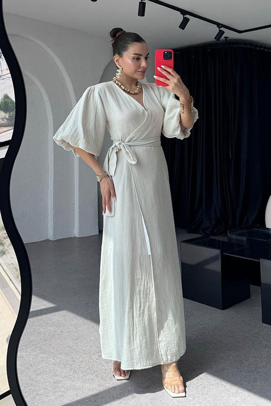 3 AL 2 ÖDEAntelo Müslin Kumaş Balon Kol Elbise - Krem