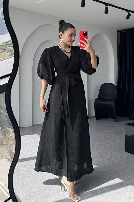 3 AL 2 ÖDEAntelo Müslin Kumaş Balon Kol Elbise - Siyah