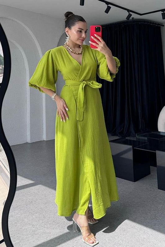 3 AL 2 ÖDEAntelo Müslin Kumaş Balon Kol Elbise - Yeşil