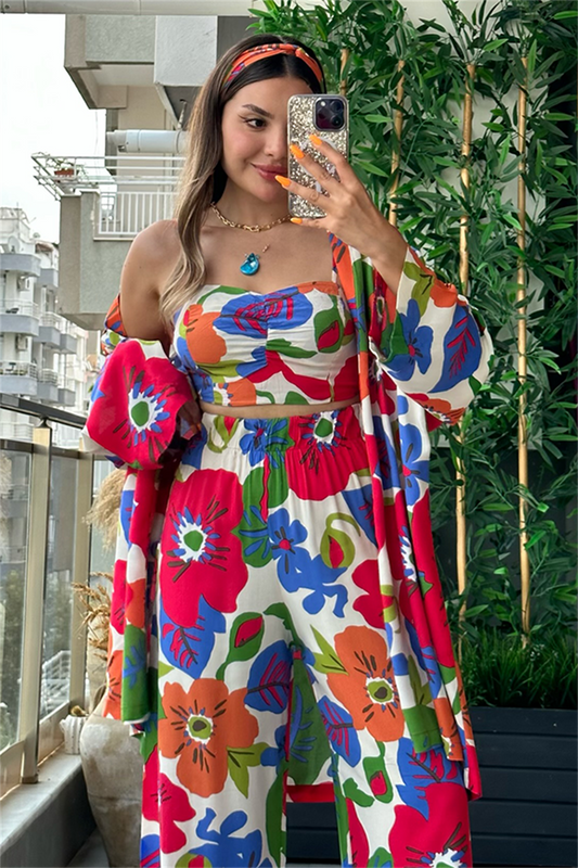 Kenneth kırmızı ağırlıklı çiçekli kimonolu takım