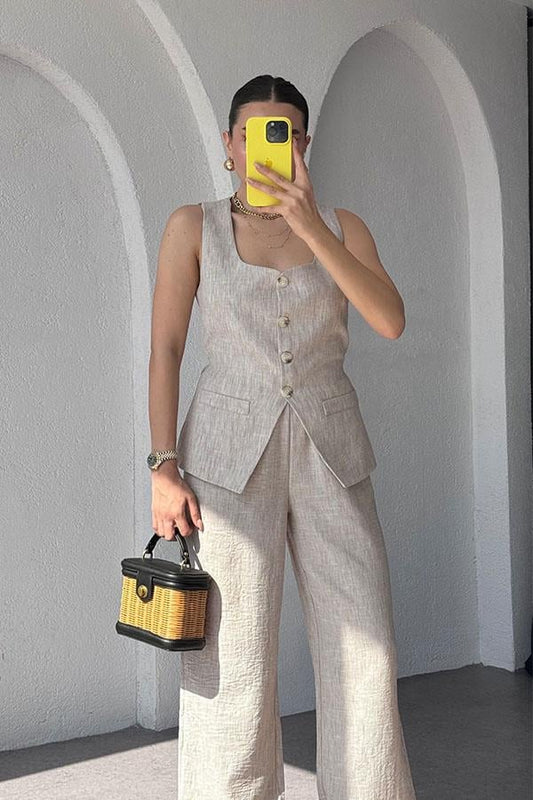 3 AL 2 ÖDEKenyon Keten Yelekli Pantolon Takım-Krem