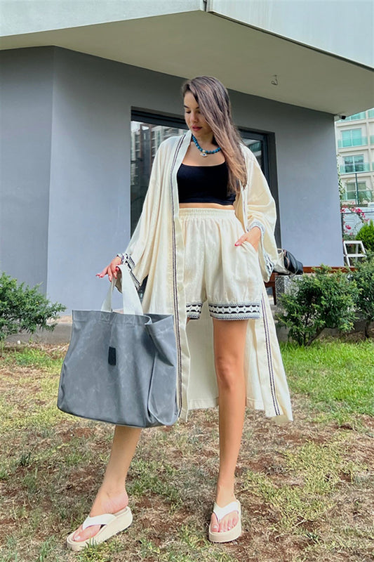 3 AL 2 ÖDEKeten ekru nakışlı kimonolu takım