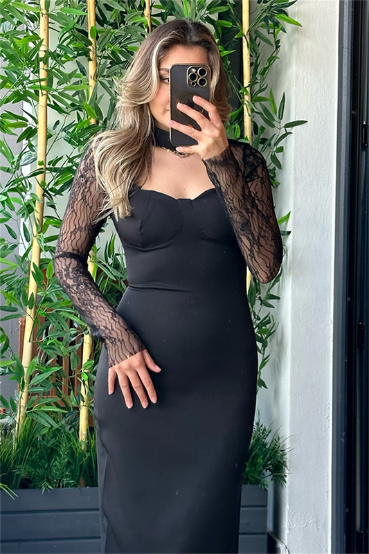3 AL 2 ÖDEKolları dantel kalp yaka kalem elbise