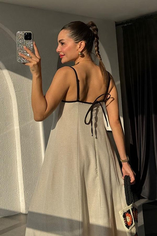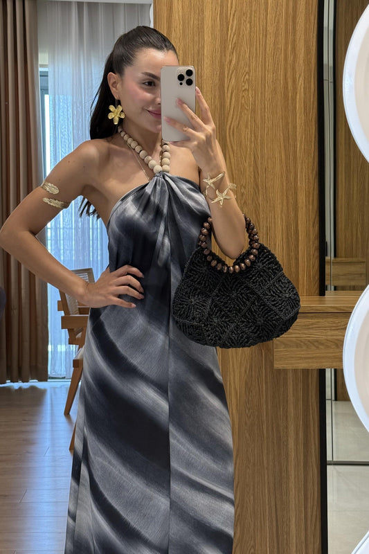 Korea Füme Boncuk Detaylı Boyundan Bağlamalı Saten Elbise