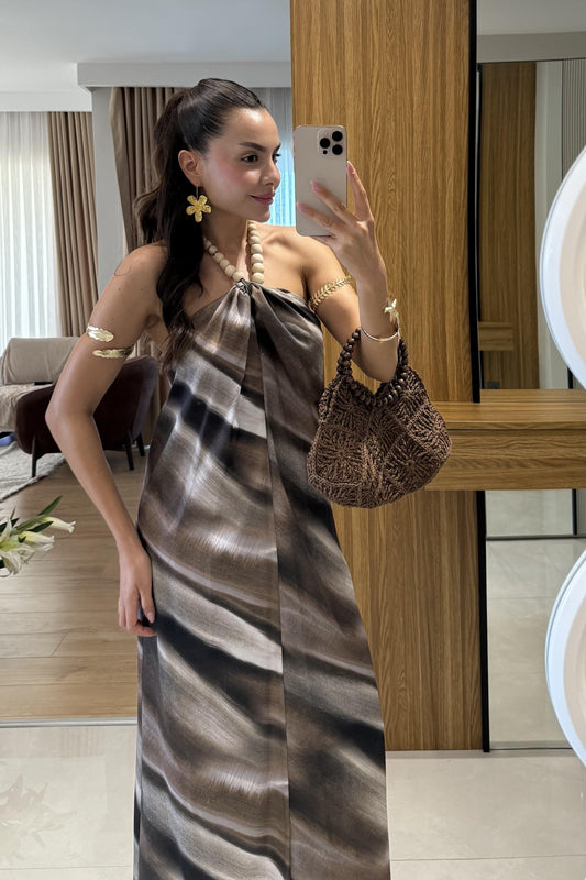 Korea Kahve Boncuk Detaylı Boyundan Bağlamalı Saten Elbise