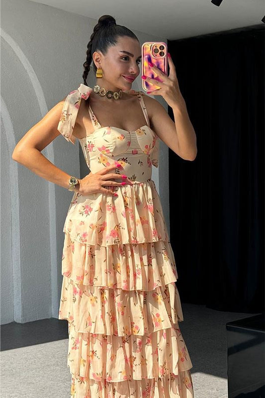 La Perla Şifon Çiçek Desen Askılı Elbise - Bej
