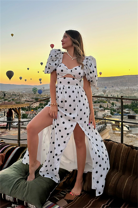 3 AL 2 ÖDELabranda beyaz puantiyeli dekolteli elbise