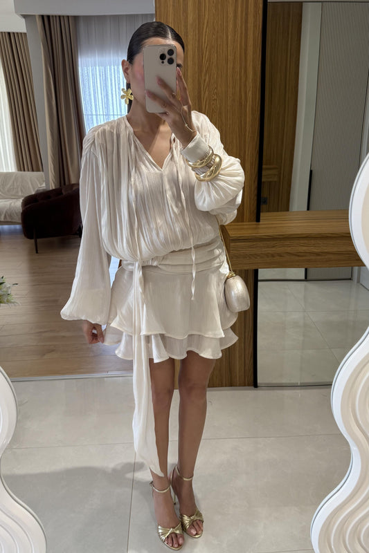 Lasarta Ekru Işıltı Dokulu Volanlı Tasarım Mini Elbise