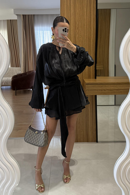 Lasarta Siyah Işıltı Dokulu Volanlı Tasarım Mini Elbise