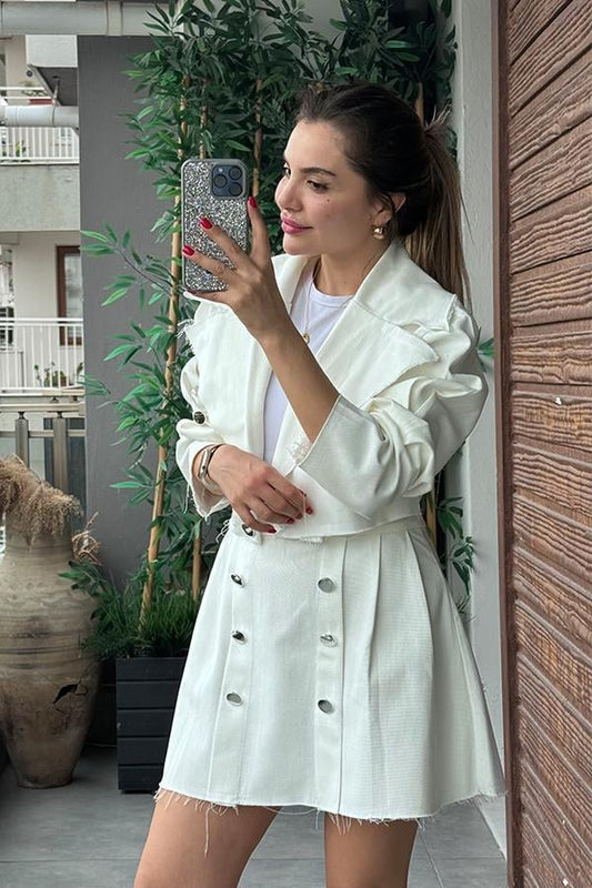 3 AL 2 ÖDELasury Düğme Detaylı Etek Ceket Takım-Beyaz