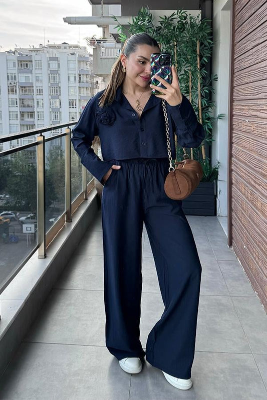 Lauran Gül Broş Detaylı İkili Takım - Lacivert