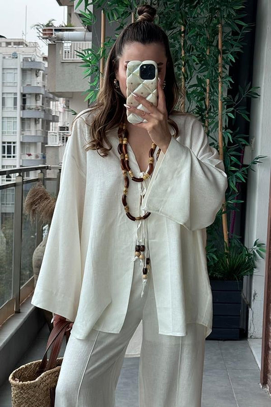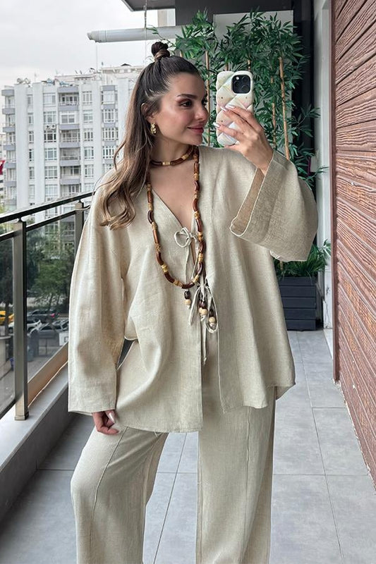 3 AL 2 ÖDELavin Keten Boncuklu Takım - Krem