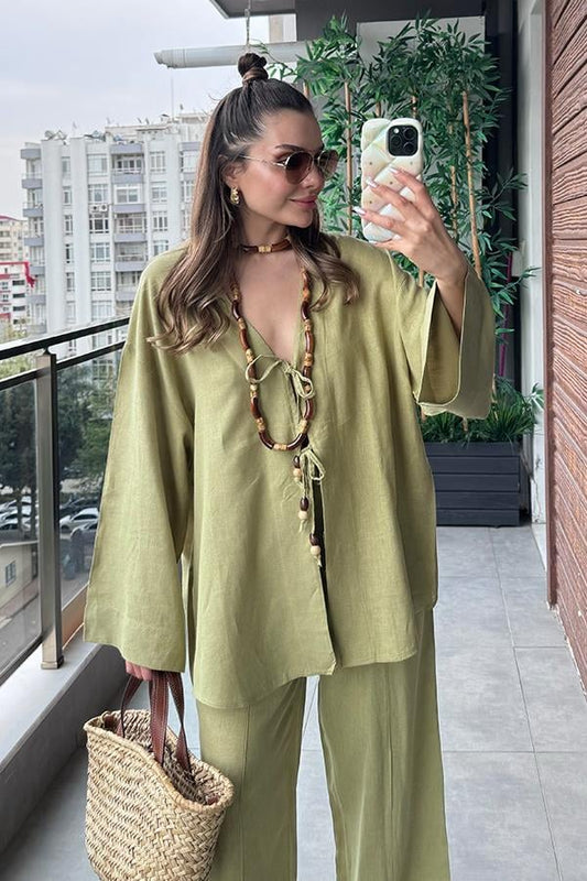 3 AL 2 ÖDELavin Keten Boncuklu Takım - Yağ Yeşil
