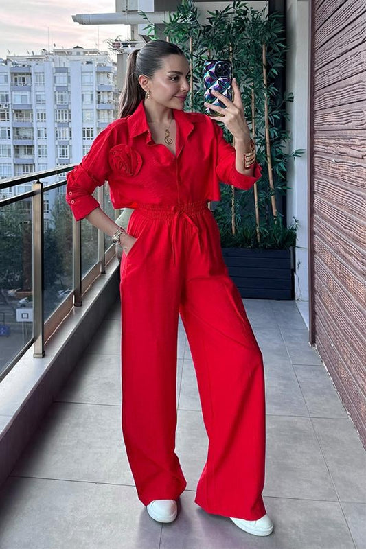 Lauran Gül Broş Detaylı İkili Takım - Kırmızı