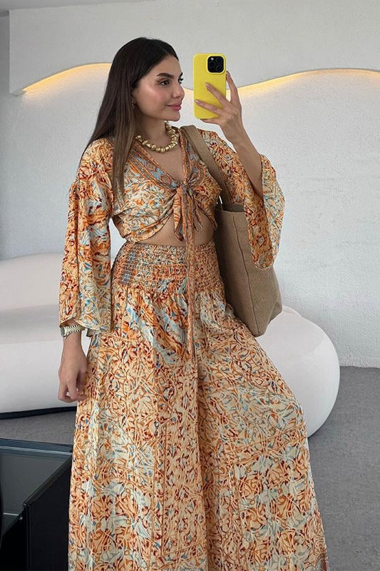 Lestari Etnik Desenli Pantolonlu Takım - Sarı