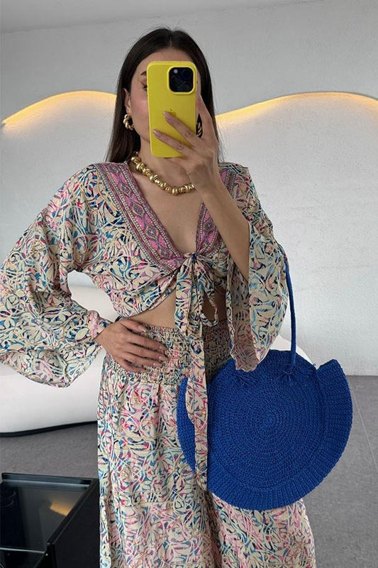 Lestari Etnik Desenli Pantolonlu Takım - Krem