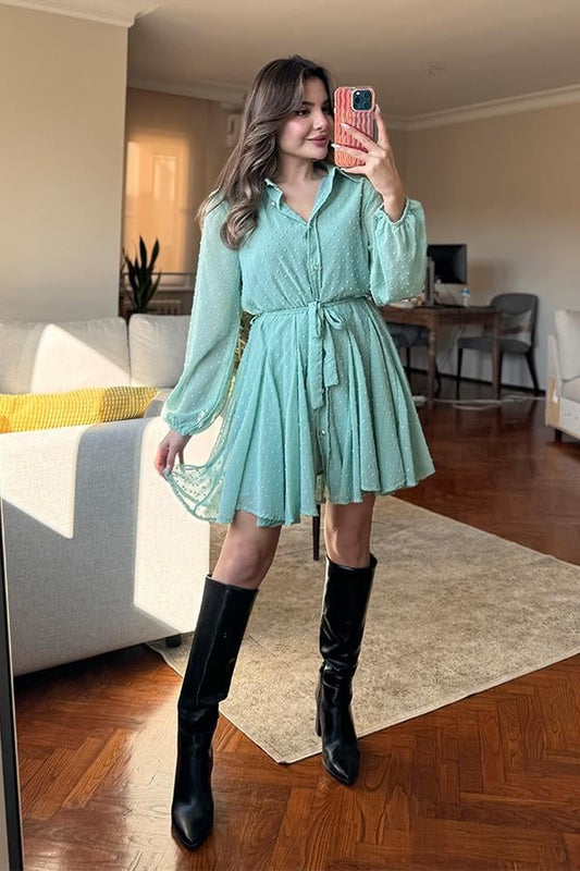 Lindsy Ponpon Detaylı Kemerli Elbise - Su Yeşil