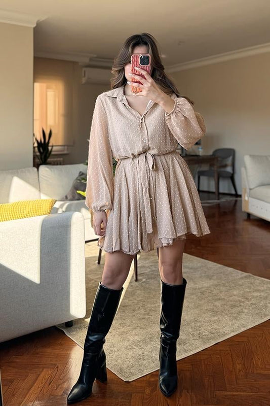 Lindsy Ponpon Detaylı Kemerli Elbise - Sütlü Kahve