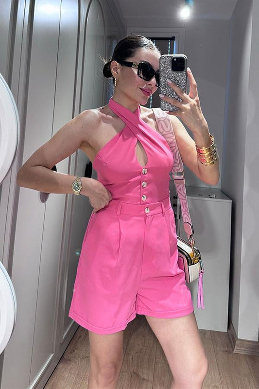 Lindon Boyundan Bağlamalı Sırt Dekolteli Şort Takım-Pembe