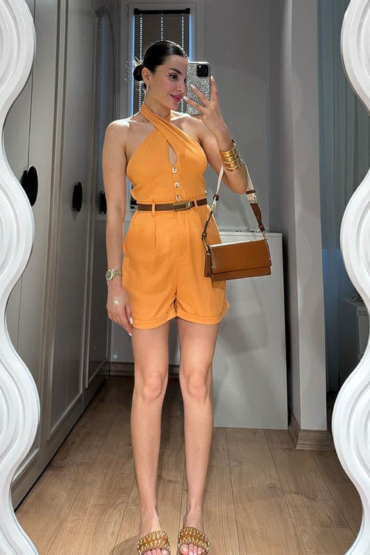 Lindon Boyundan Bağlamalı Sırt Dekolteli Şort Takım-Hardal