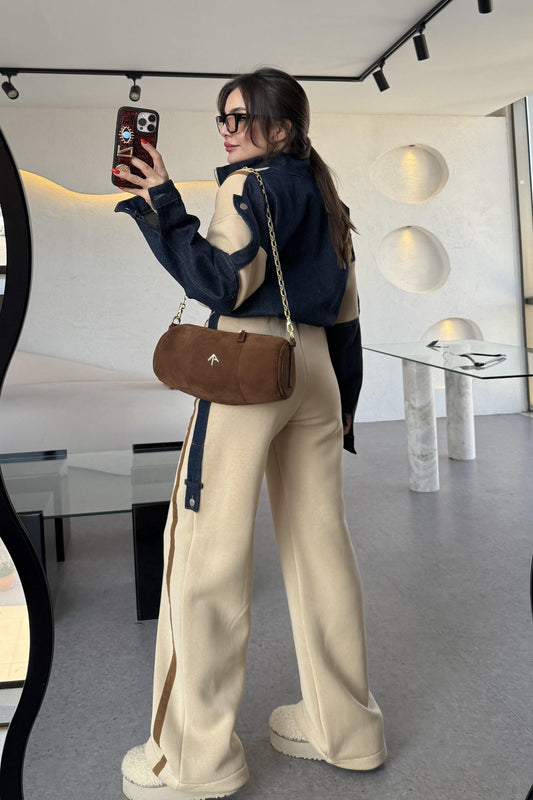 Liner Kahve Şallı Kruvaze Ceket ve Palazzo Pantolon Premium Tasarım Takım