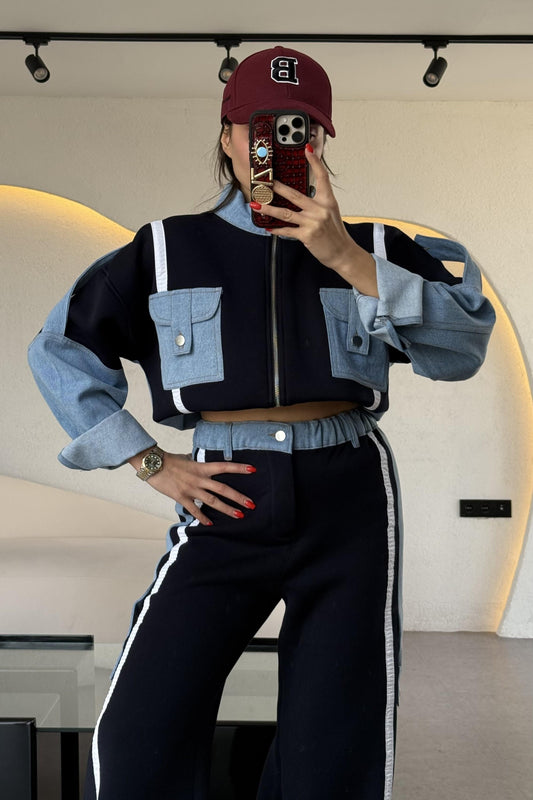 Liner Lacivert Şallı Kruvaze Ceket ve Palazzo Pantolon Premium Tasarım Takım