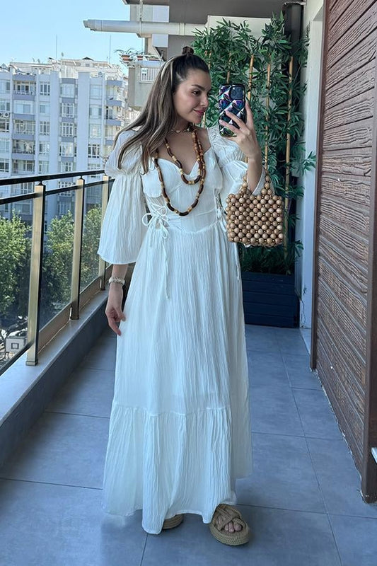 3 AL 2 ÖDELoleta Keten Kırinkıl Tasarım Elbise - Ekru