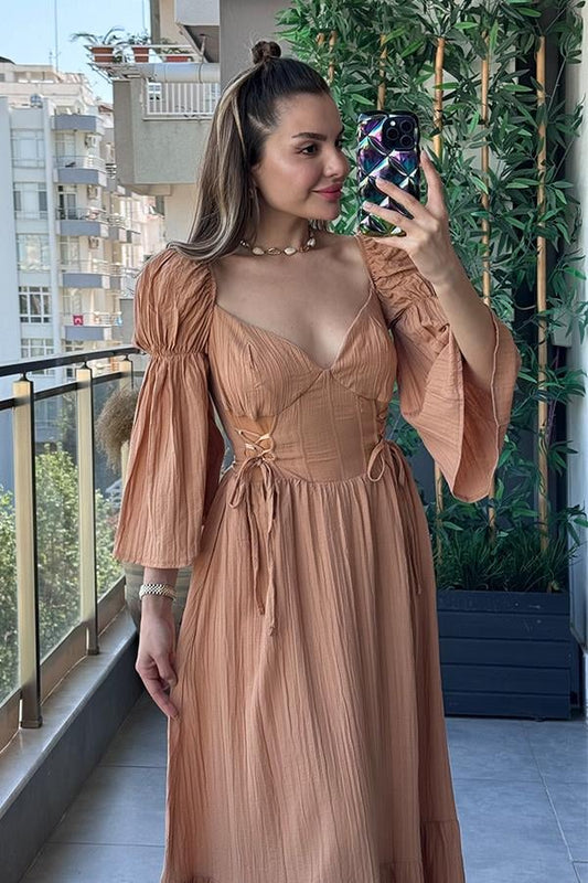 Loleta Keten Kırinkıl Tasarım Elbise - Kiremit