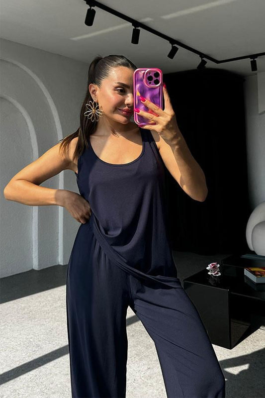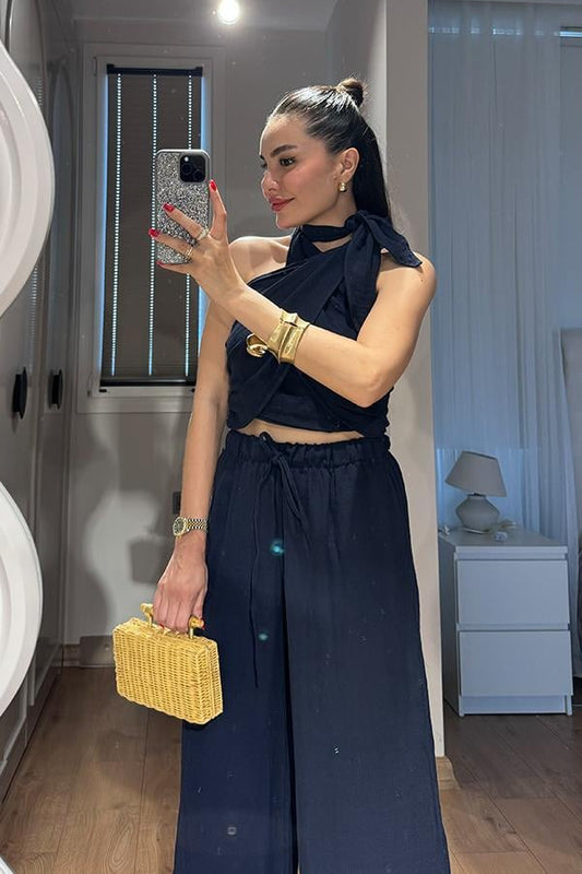 Loni Kruvaze Bağlamalı Müslin Takım - Lacivert