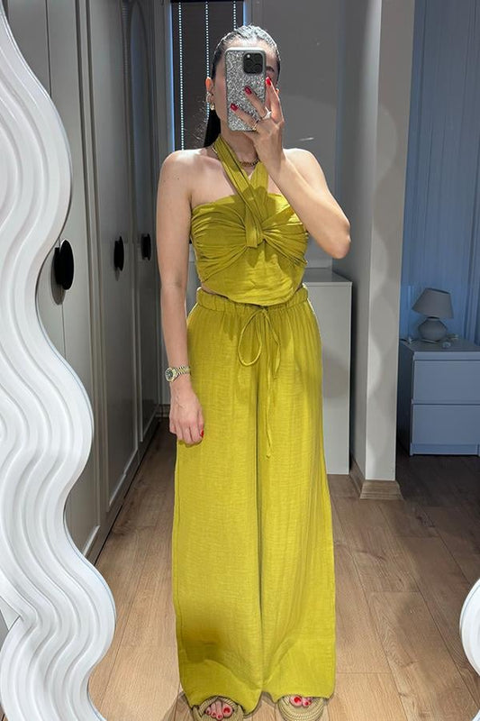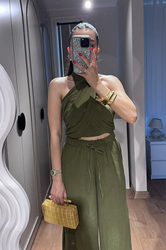 Loni Kruvaze Bağlamalı Müslin Takım - Yağ Yeşil