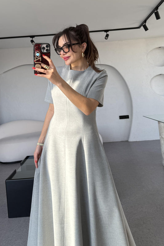 3 AL 2 ÖDELong Gri Kısa Kollu Volanlı Elbise