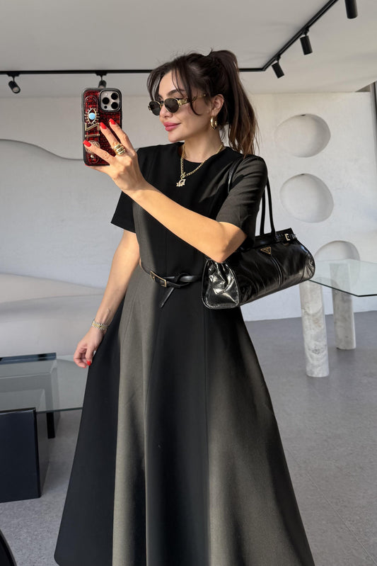 3 AL 2 ÖDELong Siyah Kısa Kollu Volanlı Elbise