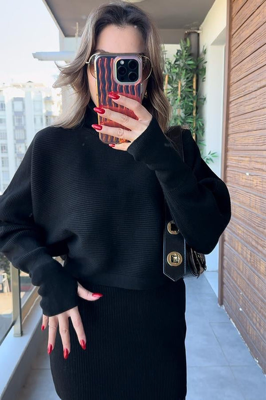 3 AL 2 ÖDELovin Boğazlı Etekli Triko Takım - Siyah