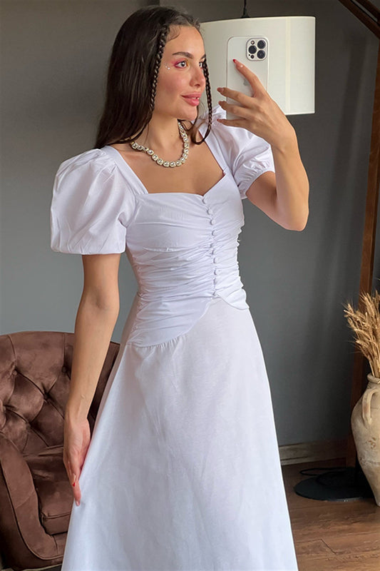 3 AL 2 ÖDELucia balon kol önü düğmeli beyaz elbise