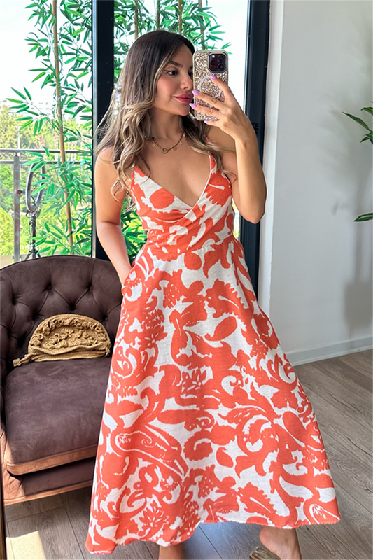 3 AL 2 ÖDELuciana keten kruvaze elbise - Turuncu