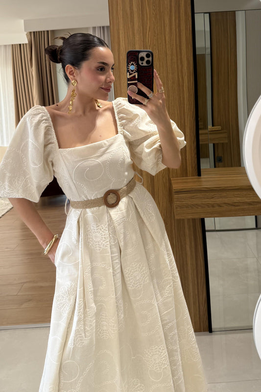 3 AL 2 ÖDELunera Balon Kollu Kemerli Brode Elbise