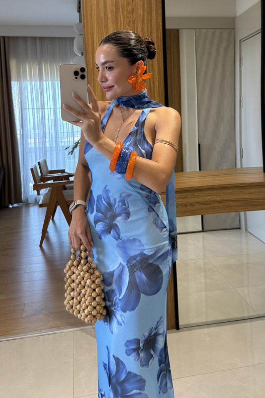3 AL 2 ÖDEMaldive Mavi Çiçek Desen Tül Astarlı Elbise