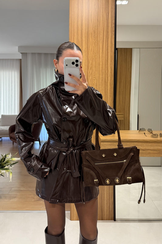 3 AL 2 ÖDEManje Acı Kahve Rugan Dik Yaka Ceket