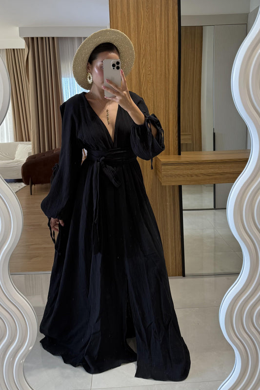 3 AL 2 ÖDEMelody Siyah Belden Kuşaklı Müslin Elbise