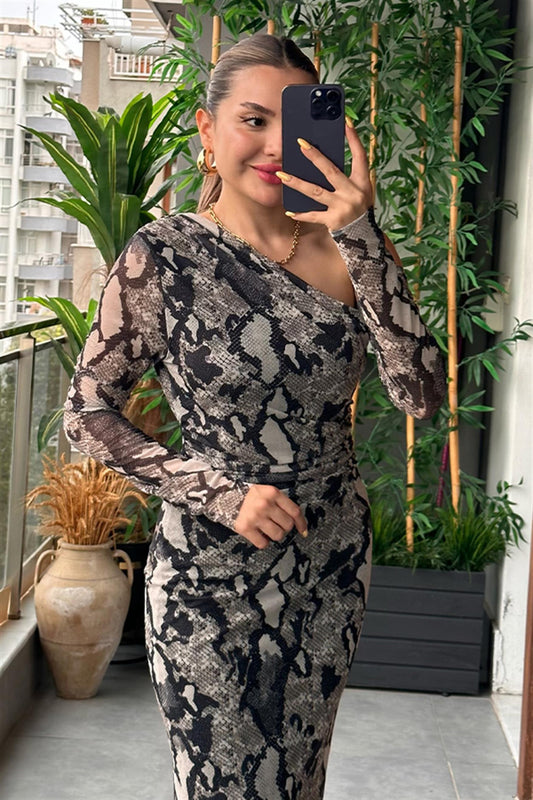 3 AL 2 ÖDEMerce Yılan Desenli Büzgülü Midi Elbise