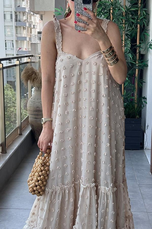 3 AL 2 ÖDEMisual Çiçek Kabartmalı Tül Elbise - Bej