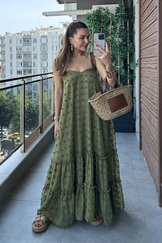 3 AL 2 ÖDEMisual Çiçek Kabartmalı Tül Elbise - Haki