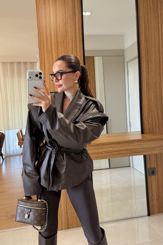 3 AL 2 ÖDENewyork Acı Kahve Tasarım Kuşaklı Deri Ceket