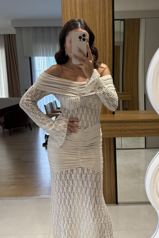 3 AL 2 ÖDENexora Bej Dantel Madonna Yaka Elbise