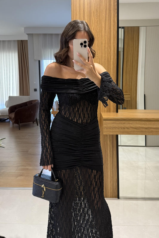3 AL 2 ÖDENexora Siyah Dantel Madonna Yaka Elbise
