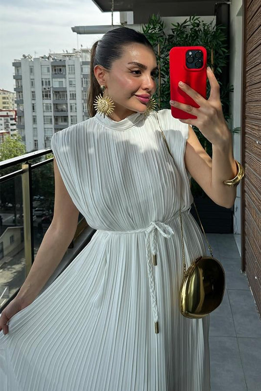 3 AL 2 ÖDENicky Bel Kemerli Piliseli Beyaz Elbise